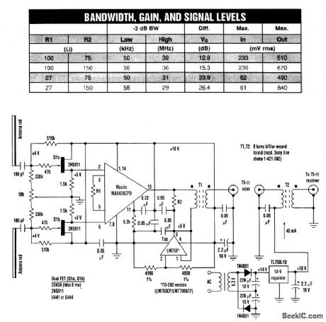 This active antenna acts as a dipole and consists of a dual FET source follower feeding a differential amplifier. The LM759 acts as a virtual ground, splitting the 10-V supply. R1 is a gain set resistor (see table). Dc is fed in via coax cable. The frequency range is 100 kHz to 40 MHz.