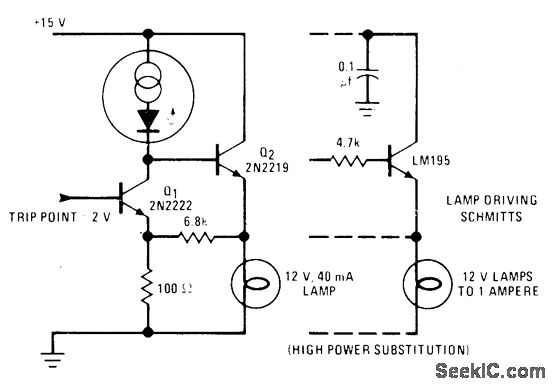 National NSL4944 constantcurrent LED serves as cuffent source for collector resistor of Schmitt trigger to provide up to 12-V output at 40 mA for lamp load. When lamp andQ2 are off, most of LED current flows through 100-ohm resistor to determine circuit trip point of 2 V. When control signal saturates Q1, Q2 provides about 1 V for lamp to give some preheating and reduce starting cument surge.When control is above trip point, Q2 tums on and energizes lamp.-''Linear Applications, Vol.2,''National Semiconductor,Santa Clara, CA,1976,AN-153,P 3.
