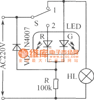 AC power working condition indicating circuit is shown as the chart, S is the 2 S 1 switch, when S is set to 1 position, the bulb HL gets power and emits light, while LED-G emits green light and it is used as the load working instructions; when the S sets 2 bit, HL is off, LED-G is extinguished, only the LED-R emits red light, which is used as indicating mains supply.