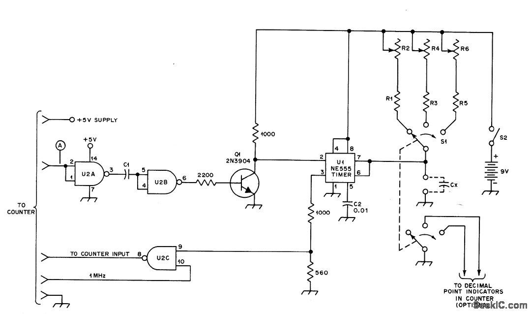 Converts counter into digital capacitance meter for measuring valuesclown to around 5 pF with better than 1% accuracy. Three ranges give full-scale values of 99,999 pF, 0,99999 μF, and 9.9999μF. Positive-going countenable command from frequency counter, applied to point A of gate U2A, removes short-circuit from unknown capacitor CX and enables gate U2C. Capacitor charges exponentially through R1 and R2 (range 1) to voltage at which threshold comparator at U1 makes flip4lop change state, shorting CX and disabling gate U2C. During charge time, 1-MHz pulses are applied to counter input. Counter reading then corresponds to capacitor value . C1 is 18 pF.R1 is 860K,R2 is 100K,R3 is 86K,R4 is 10K,R5 is 8.6K,R6 is 1K,and U2 is 7400 quad NAND gate.-R.F. Kramer,Using a Frequency Counteras a Capacitance Meter,QST. Aug 1977, p 19-22.