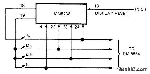 Capability of 8-digit four-function Novus 850 calculator made by National Semiconductor (also marketed as Montgomery Ward P50) can be doubled by adding four SPST swhches and connecting as shown. These provide additional functions of memory store, memory recall, percent, and constant. Switches can be put on front panel above display, at corners of battery. Cutler Hammer SA1BV20 SPST switches with SW53AA1 caps can be squeezed in.-D. Amett, Add Memory, Constant and % to a 4-Function Calculator, EDN Magazine, Aug. 20, 1975, p 82.