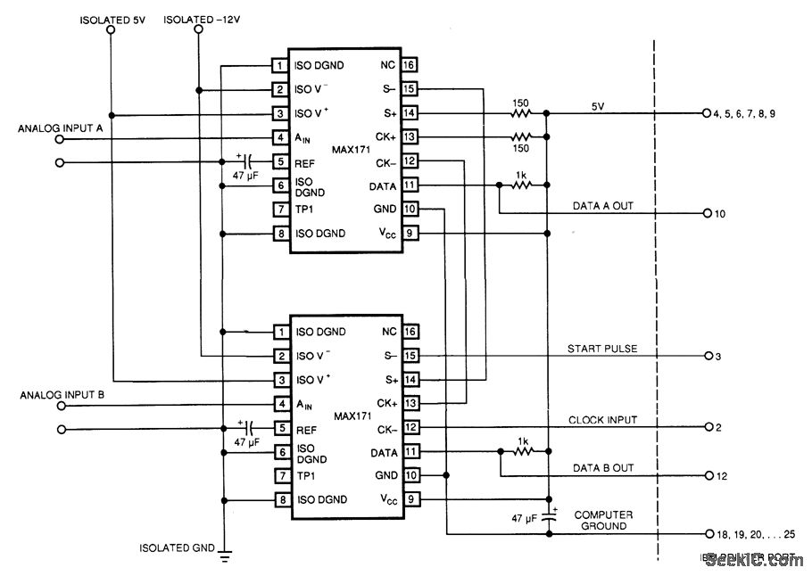 An IBM PC can operate the two 12-bit A/D converters in Fig. 1 via its printer port. The converters' serial outputs use only two of the printer port's eight data lines (DATA A OUT, DATA B OUT). Because the IBM PC's printer port supplies no power, interface software running on the PC programs the six unused data lines high. Busing these data lines provides power for the digital portion of the A/D con-verters. (The converters have internal optoisolators. Consequently, you must provide isolated supplies for their analog sides.)