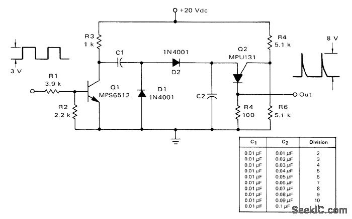 Ratio of C2 to C1 determines division ratio, as given in table. When C2 charges to peak point firing voltage of Q2, it fires and discharges C2, so C1 charges to line voltage. Q2 then turns off. Next cycle begins with another positive pulse on base of Q1, discharging C1. Division range can be chanced by utilizing programmable aspect of PUT Q2 and changing ratio of resistances.-R. J. Haver and B. C. Shiner, Theory, Characteristics and Applications of the Programmable Unijunetion Transistor, Motorola, Phoenix, AZ, 1974 AN-S27, p 9.