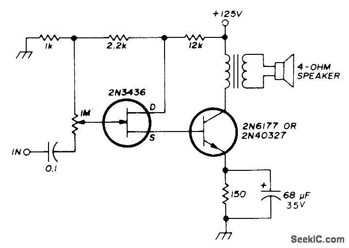 Operates directly from 125-V rectified AC line voltage. Combination of unipolar and bipolar transistors gives desirable amplifying features of each solid-state device.-I. M.Gottlieb, A New Look at Solid-State Amplifiers, Ham Radio, Feb. 1976 p 16-19.