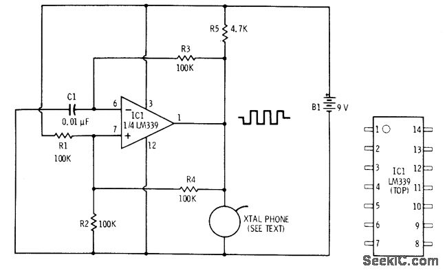 With value shown for C1, frequency of output square wave is 530 Hz. For 5300 Hz, use 0.001 μF; for 53 Hz, use 0.1 μF. Circuit will drive ordinary crystal earphone or crystal microphone used as earphone.-F. M. Mims, Integrated Circuit Projects, Vol. 5, Radio Shack, Fort Worth, TX, 1977, 2nd Ed., p 52-56.