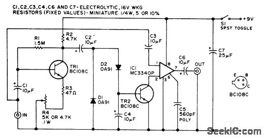 Simple audio squelch circuit suppresses all input signals below preset threshold.-Circuits, 73 Magazine, Holiday issue 1976, p 170.