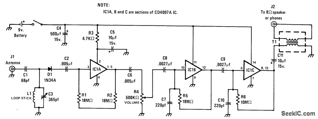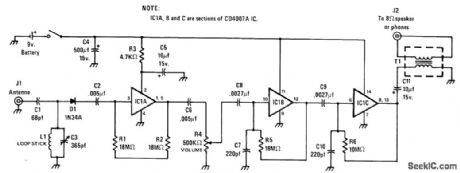 Uses CD4007A IC, having complementary ρair of opamps and inverter, to provide all circuits for AM broadcast radio capable of driving headphones or 8-ohm loudspeaker, Selectivity is provided by single tuned circuit and can be improved by optimizing value of C1 to adjust antenna loading. Tune with C3, adjusting L1 if necessary to get stations at low end of band. - C. Green, Easy-to-Build CMOS Radio Receiver, Modern Electronics, Sept. 1978, p 4-41, 46, and 59.