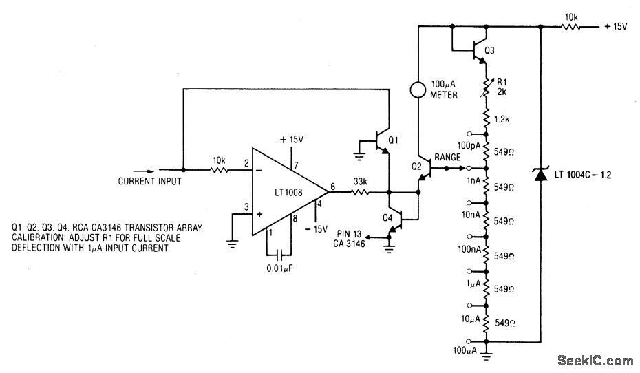 The Ammeter measures currents from 100 pA to 100 μA without the use of expensive high value resistors. Accuracy at 100 μA is limited by the offset voltage between Q1 and Q2 and, at 100 pA, by the inverting bias current of the LT1008