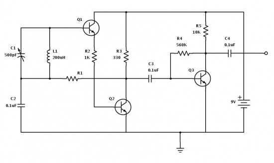 It can use general purpose transistors, and in this example there are 3 BC109C transistors. The schematic and BOM show a 200µH inductor and a trimmer capacitor 150-500pF, though these parts can be salvaged from an old AM radio, to preserve the directional nature of a tuning coil, and an adjustment knob (plate capacitor) that work well for radio reception.