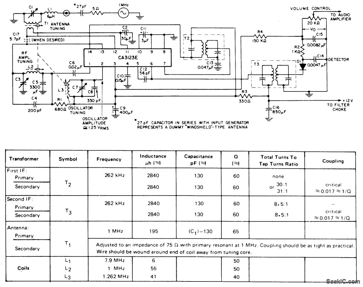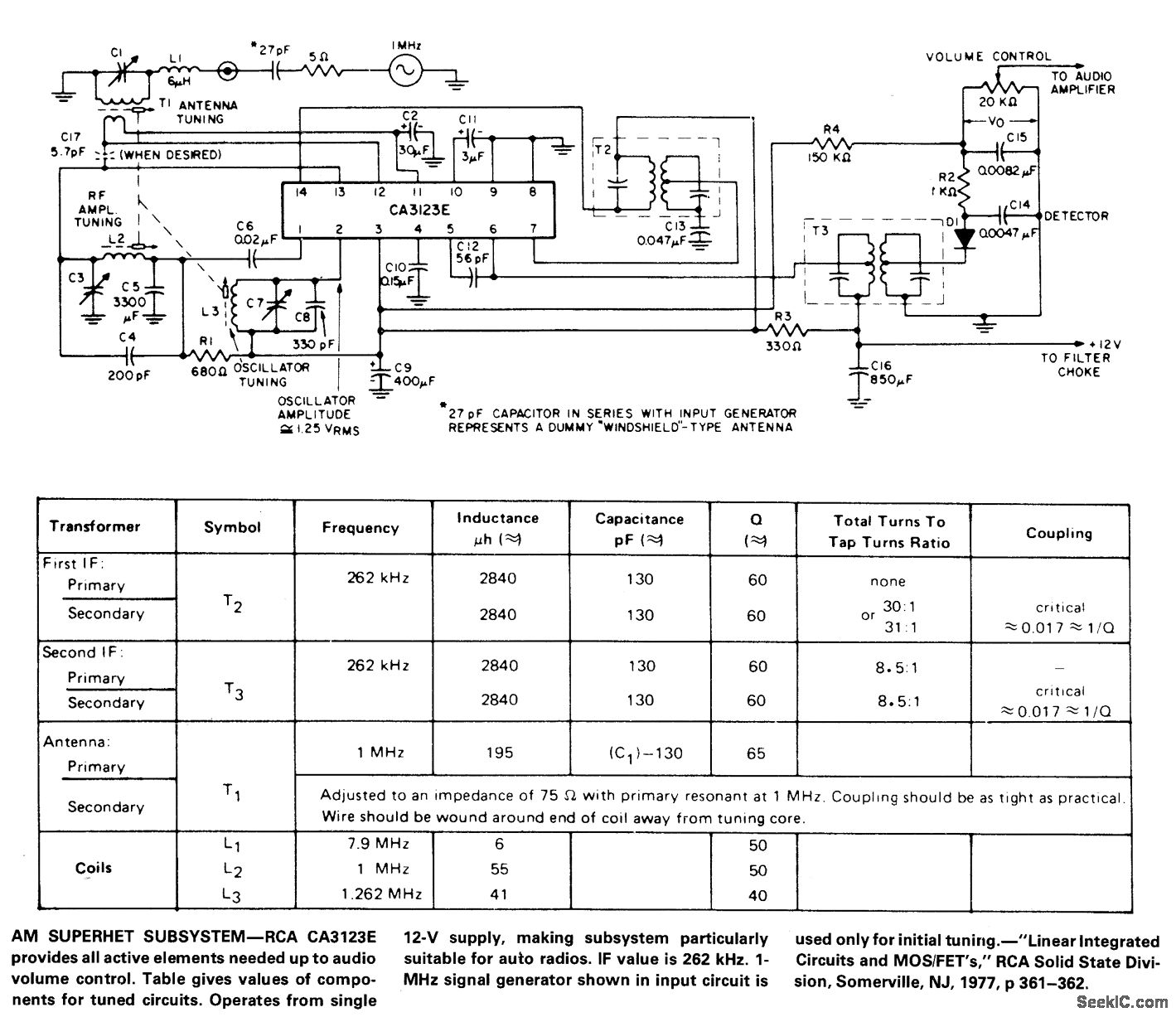 RCA CA3123E provides all active elements needed up to audio volume control Table gives values of components for tuned circuits Operates from single 12-V supply, making subsystem particularly suitable for auto radios. IF value is 262 kHz. 1-MHz signal generator shown in input circuit is used only for initial tuning.- Linear Integrated Circuits and MOS/FET's , RCA Solid State Division, Somerville, NJ 1977, p 361-362.