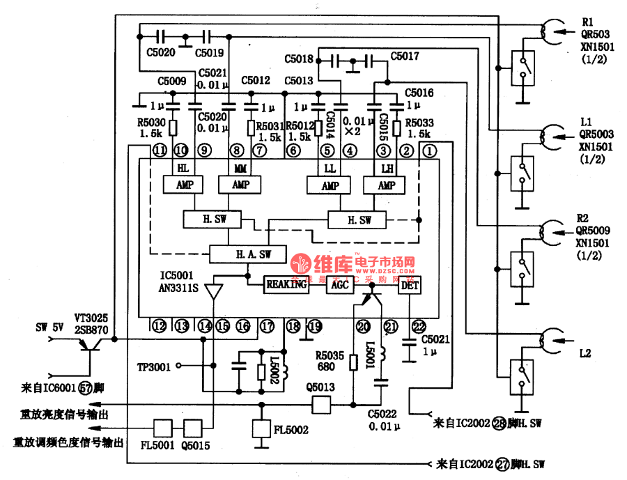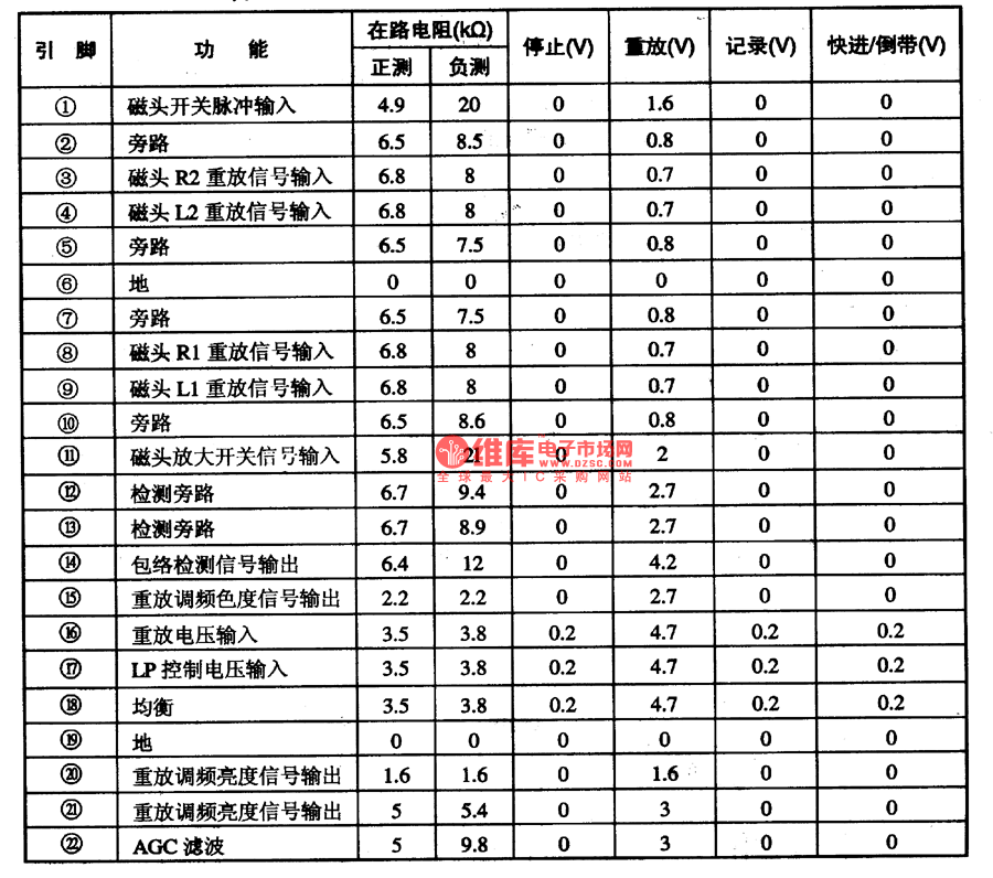 The AN3311S integrated circuit has the 4 magnetic read head preamplifier, the magnetic read head switching switch, the envelope comparator, the peak value amplification circuit, the color changing amplification circuit, the AGC amplification circuit. The internal circuit block diagram and the typical application circuit is as shown in figure 1-14, the pin functions and data is as shown in table 1-13.
