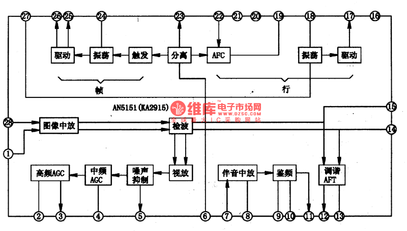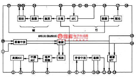 The AN5151 has the functions of image and accompanying sound medium amplification, the AGC medium amplification, the AGC high amplification, AFC, AFT, line and field scanning oscillation. The internal circuit block diagram is as shown in figure 1-16.