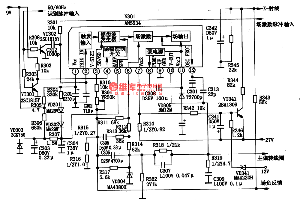 The AN5534 is composed of the field oscillation sawtooth wave signal generating circuit, the field incentive and output circuit. The internal circuit block diagram and the typical application circuit are as shown in figure 1-18.