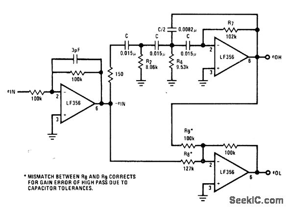 High-pass and low-pass active filters using National LF356 opamps are asymmetrical about 500-Hz crossover point,Sum of filter output voltages is always constant and equaltounity,Rolloff of low-pass filter is only-6 dB peroctave、as compared to-18 dB per octave for high-pass filter,-″Audio Handbook″ National semiconductor, Santa Clara,GA,1977、p 5-1-5-7.