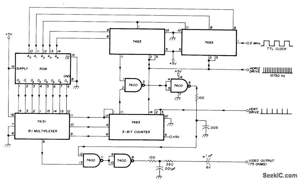 Uses 32×SPROM togenerate up to six characters of amateur call Squares in matrix are numbered 1-32 horizontally and 1-8 vertically starting from upper left. and black squares forming call letters are programmed as 1s in PROM Pin connections shown for PROM are valid for AMI 27508/27509,82S23/82S123,MM5330/MM5331、HPROM 8256、and IM5600/5610. Two 7493 binary counters address all 32 words in ROM, with clock rate (2-3 MHz) determining length of characters on screen. 74151 multiplexer advances to next ROM output once per scan Line, under control of 7493 3-bit counter clocked by horizontal drive pulses from sync generator of ATV transmitter. Positive-going horizontal drive pulses reset 5-bit word counters, while positive-going vertical drive pulses reset 3-bit line counters, to make characters appear in same position on screen for all fields.-J. Pulice, Amateur Television Callsign Generator, Ham Padio, Feb. 1977, p 34-35.