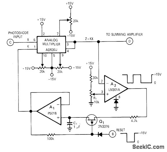 Automatic scaling circuit permits frequent and fast recalibration for precision optical measurements, to compensate for variations in light intensity due to thermal cycling of lamp filament, dirty optics, and gain variations between photodetectors and between amplifiers. With reset pulse at point B, comparator A2 compares output of multiplier to preset reference voltage on R1. If A2 input voltage is greater than reference applied to pin 3 by R2, output switches to zero and remains there until C1 has discharged enough to lower output of A1 and output of multiplier below reference on pin 3. If input at pin 2 ofA2 is less than reference on pin 3,A2 will switch to 15 V and output of multiplier will be adjusted upward until voltage on pin 2 of A2 again exceeds that on pin 3. Output of A2 is thus continually switching between 15 V and 0 V during reset or scaling. After reset pulse is removed, scale factor K is maintained constant by multiplier during measuring.-R. E. Keil, Automatic Scaling Circuit for Optical Measurements, EDN/EEE Magazine, Nov. 15, 1971, p 49-50.