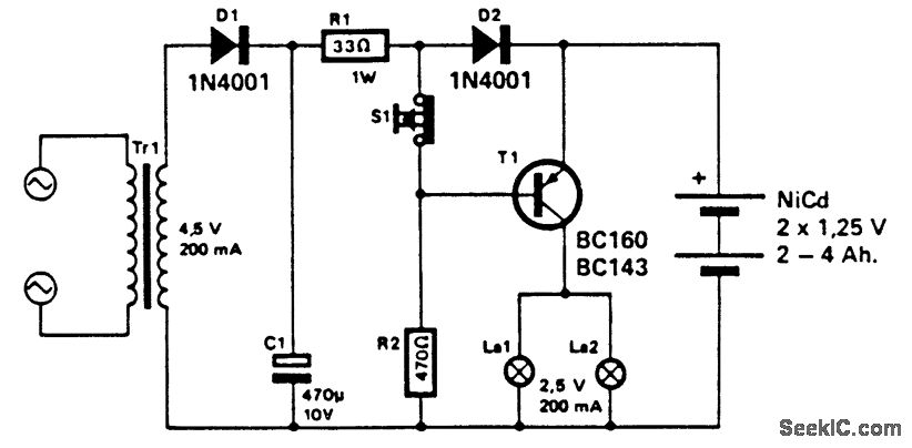 This unit uses a Nicad battery to provide power to an emergency lighting setup. When power fails, T1 becomes forward biased, which lights L1 and L2. The batteries are normally kept charged. When power is on, T1 is cut off and it keeps the lamps extinguished.
