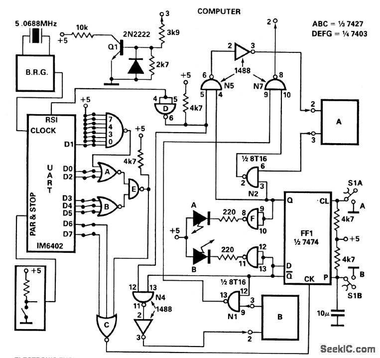Transistor Q1 converts RS-232 levels to TTL levels while two LEDs indicate whether device A or B is linked. The baud-rate generator provides the 16 x clock needed for the UART. Any baud rate ranging from 50 to 19200 can be selected. Manual control of the selector is available with toggleswitch S1.