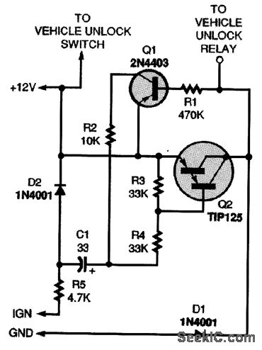 When the ignition switch is on, the +12V and IGN lines connected to the circuit are within half a volt or so of each other. Resistor R3 reverse-biases Darlington Q2 and keeps it cut off. Transistor Q1 is in parallel with Q2's emitter and collector; Q1 is ON as a result of the large voltage drop across Q2's emitter and collector. When the ignition switch is turned off, voltage is removed from the IGN line, effectively placing R5 at ground level. Capacitor C1 provides a path for current to flow through R3 to R5 and the vehicle components to ground. That flow will forward-bias Q2, driving it into saturation and lowering its emitter/collector voltage to less than 0.5 V. As a result, almost full battery voltage is applied to the vehicle unlock relay; transistor Q1 is cut off at the same time. The voltage divider of R3 and R4 prevents false triggering during voltage sags on the IGN line.