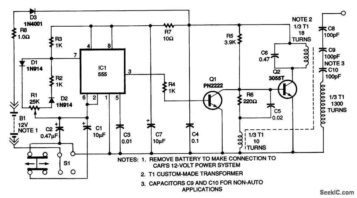 A 555 timer drives driver transistor Q1 and switching transistor Q2 at 25 to 30 kHz. T1 is wound on a ferrite core (try using a core from an old B/W TV flyback) and has the windings arranged as shown in the schematic. About 2500 Vac p-p is produced, so be careful to avoid any possibility of contact with this voltage, as it can cause a bad shock or RE burn. The neon tube is a custom-size item that can be made up at any neon sign shop or possibly purchased commercially. It is not legal to illuminate certain parts of your vehicle in some parts of the United States and in some nations.