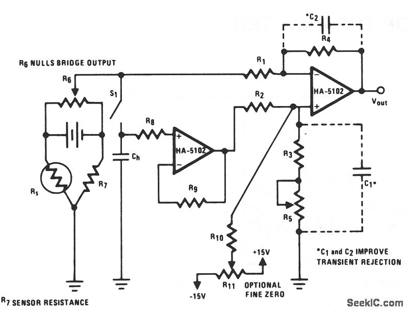 The bridge signal drives the inverting input of a differentially configured HA-5102. The noninverting input is driven by the other half of the HA-5102 used as a buffer for the holding capacitor, CH. This second amplifier and its capacitor CH form the sampling circuit used for automatic output zeroing.The 20-KΩ resistor between the holding capacitor CH and the input terminal, reduces the drain from the bias currents. A second resistor RG is used in the feedback loop to balance the effect of R8. If R7 is approximately equal to the resistance of the strain gauge, the input signal from the bridge can be roughly nulled with R6. With very close matching of the ratio R4/R1 to R3/R2, the output offset can be nulled by closing S1. This will charge CH and provide a 0-V difference to the inputs of the second amplifier, which results in a 0-V output. In this manner, the output of the strain gauge can be indirectly zeroed. R10 and potentiometer R11 provide an additional mechanism for fine tuning VOUT, but they can also increase offset voltage away from the zero point. C1 and C2 reduce the circuit's susceptibility to noise and transients.