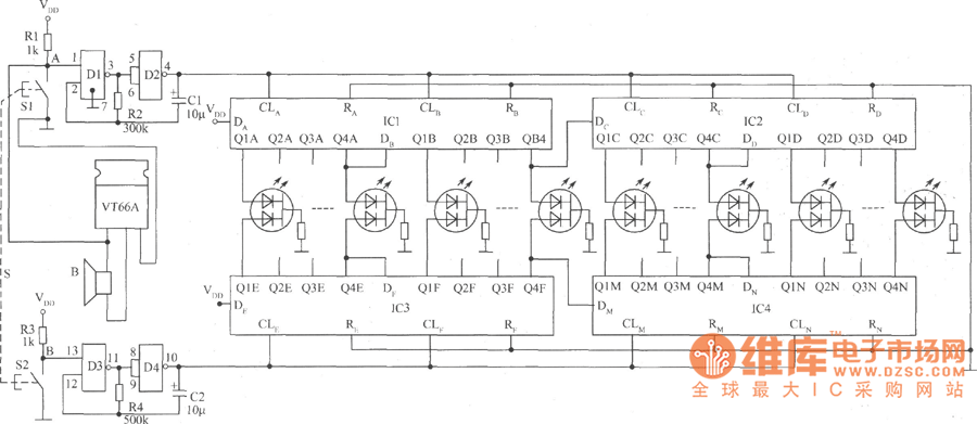 IC1 ~ IC4 are four pairs of CD4051 4-bit shift register; D1 ~ D4 use a CD4011 2 input NAND gate. Color tri-color LED is 2EF302.