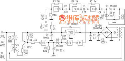 When a sound wave compression electret microphone MIC, MIC can output a weak audio signal fed from the NAND gate F1, F2, F3 and R3, R4, R5 constitute the three continuous linear amplification of the amplifier circuit , if consider peak waveform distortion , the output signal amplitude F3 has been large enough , after this signal is coupled through C4 by D1, D2 rectifier get unipolar pulses C5 charging. VC5 soon more than 1/2VDD, the output of NAND gate F4 0, F5 output is 1 , high charge to C8, VC8 also soon be greater than 1/2VDD, F6 output is 0 , the transistor T saturated conduction , SCR is trigger , so 220V mains supply via socket CZ to the recorder , recording starts ; If the sound disappears, the C5 voltage can not be maintained , VC5 quickly dropped to zero. Similarly , C8 only slowly discharge to R8, VC8 about three seconds after the drop to 0 , then , SCR deadline , tape recorders recording aborted ; so, automatic recording control recording ( if necessary delay longer available appropriate to increase the capacity of C8 ) .