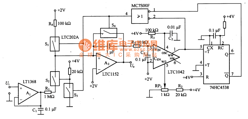 The picture shows a window comparator circuit made by LTCl042. In this circuit, LTC1042 is the window comparator which is used to test integrator and carry out the original reset of it according to the different needs. The first condition of integrator is to select the accuracy of the time periods it needs. After this, the second step is to select the components that can meet the needs of the accuracy, especially the operation amplifier and integrated capacitor. For example, to the operation amplifierμA741 with input differential current of 80 nA, its inaccuracy is 1% when the time period is 0.25 s, however, to LTC1152 with input differential current of 100 pA, its inaccuracy is 1% when the integrated time period is 200 s. In order to improve the accuracy, integrated capacitor uses polystyrene, polytetrafluoroethylene(PTFE) and so on.