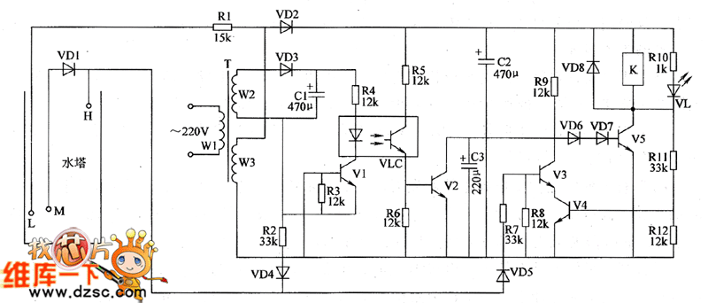 The agricultural automatical water feeder circuit is composed of the power supply circuit, water level detection circuit, control circuit and control implementation circuit, and the circuit is shown as the chart 1. Power supply circuit is composed of the power transformer T, rectifier diodes VD2, VD3, and filter capacitors C1, C2. Water level detection circuit is composed of water level detecting electrode H, electrode L, electrode M, diode VD1 and resistor R1. Control circuit consists of transistors V1 ~ V4, resistosr R2 ~ R9, R11, R12, diodes VD4, VD5, optical coupler VLC and capacitor C3. Control implementation circuit consists of the transistor V5, diodes VD6 ~ VD8 and relay K.