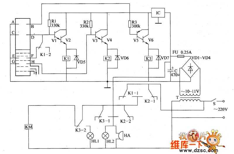The agricultural automatical water feeder circuit is composed of the water level detection control circuit, sound and light alarm circuit and power supply circuit,and the circuit is shown as the chart 1. Power supply circuit is composed of the power switch s, power transformer T, rectifier diodes VD1 ~ VD4, fuse FU, filter capacitor C and the three-terminal voltage regulator integrated circuit IC. Water level detection control circuit consists of water level detection electrodes A ~ H, transistors V1 ~ V6, relays K1 ~ K3, diodes VD5 ~ VD7 and resistors R1 ~ R3. Sound and light alarm circuit is composed of the lights HL1, HL2, HA, and alarm control contacts K1 ~ K3. R1 ~ R3 select 1/4W carbon film resistors or metal film resistors.