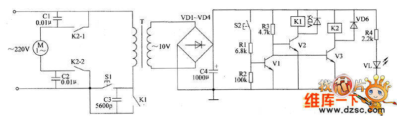 The agricultural automatical water feeder circuit is composed of the power supply circuit and control circuit, and the circuit is shown as the Figure 1. Power supply circuit is composed of the power control button S1, the normally open contacts of relay K1, power transformer T, rectifier diodes VD1 ~ VD4, capacitors C3, C4, resistor M and power indicator LED VL. The control circuit is composed of the triggered button S2, resistors R1 ~ R3, transistors V1 ~ V3, diodes VD5, VD6, capacitors C1, C2 and relays K1, K2. RI ~ R4 select l/4W metal film resistors or carbon film resistors.