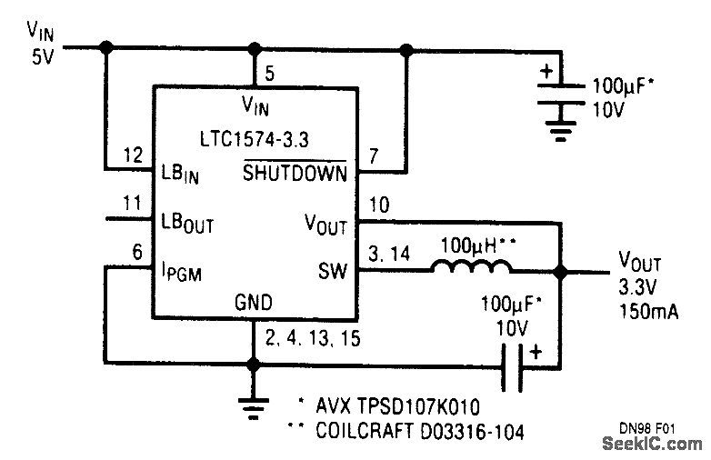 This converter provides 3.3 V at 150 mA from an input voltage of 5 V. Peak inductor current is limited to 340 mA by connecting pin 6 (IPGM) to ground. For applications requiring higher output current, connect pin 6 to Vin. Under this condition, the maximum load current is increased to 425 mA.