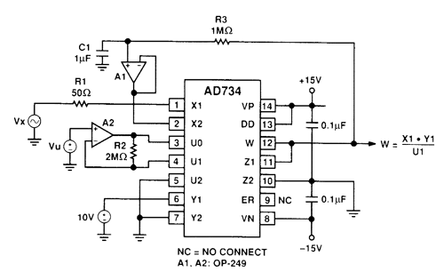 An output voltage (W=X1×Y1/U1) is produced by Lhis multiplier circuit The AD734 is a fourquadrant multiplier.
