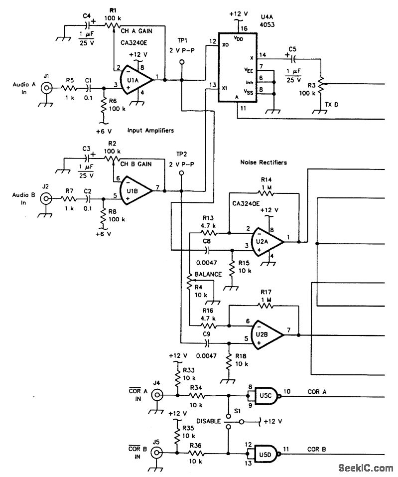 The purpose of this circuit is the selection of the output of two receivers, tuned to the same channel, that has the better signal to noise ratio. This circuit compares the two noise leads from the receivers and selects the one with the lower audio noise level.