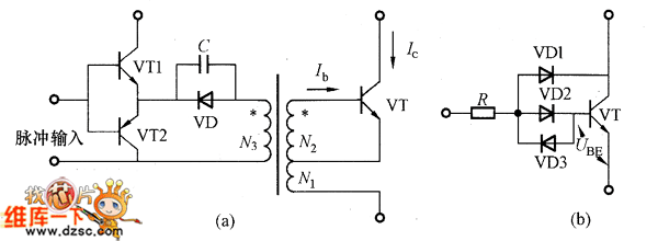 The base electrode driving circuit example is shown in the picture. When the base electrode current is big, to prevent the increasing of the storage time, it can use the Bekaa clamp circuit shown in picture (b). In the circuit, the base electrode current increases, when the transistor VT's saturation voltage is lower than UBE, the diode VD1 would be conducted. Thus it could prevent the increasing of the base electrode current. It is a circuit to prevent overexcitation.