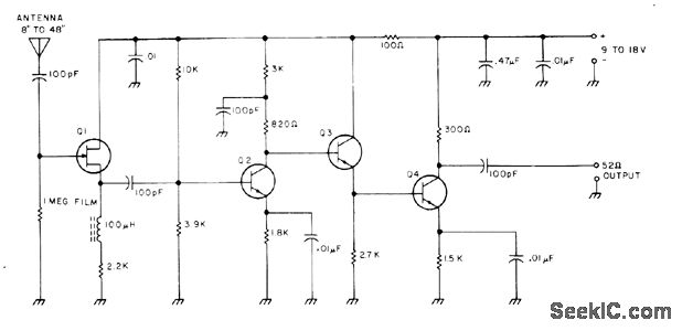 Cornbination of short whip antenna and broadband amplifier gives antenna covering entire range of 3 to 30 MHz without frequency selectivity. at is 2N3819 FET source follower driving three-transistor amplifier using 2N918, 2N6008, or other 200-MHz 20V NPN transistors to provide 30-dB gain. Circuit rolloff starts at 3 and 35 MHz. High gain of am plifier makes combination simulate quarter-wave whip over entire frequency range.-R. C.Wilson, The Incredible 18 All-Band Antenna, 73 Magazine, March 1975, p 49-50.