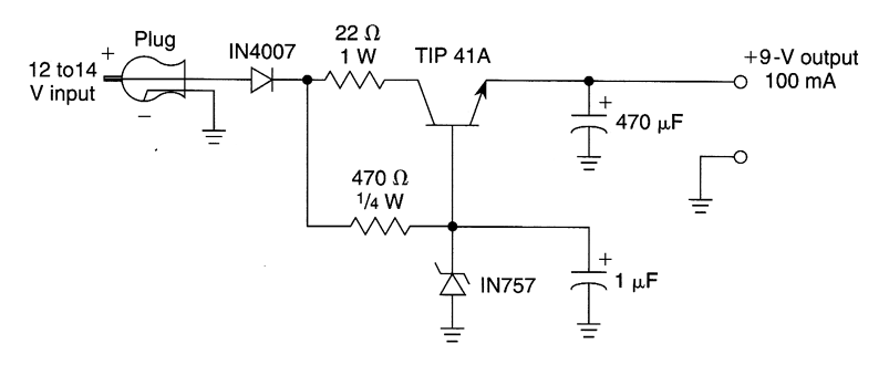 A simple way to provide +9 V at 100 mA from a 12-V auto source. Applications include small radios, cassettes, etc.