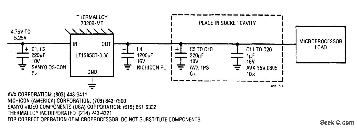 New high-performance microprocessors require a fresh look at power-supply transient response.The LT1585 linear regulator features 1% initial accuracy, excellent temperature drift and load regulation, and virtually perfect line regulation. Complementing superb dc characteristics, the LT1585 exhibits extremely fast response to transients. Transient response is affected by more than the regulator itself. Stray inductances in the layout and bypass capacitors, as well as capacitor ESR dominate the response during the first 400 ns of transient.The ftgure shows a bypassing scheme developed to meet all the requirements for the Intel P44C-VR microprocessor. Input capacitors C1 and C2 function primarily to decouple load transients from the 5-V logic suppJy. The values used here are optimized for a typical 5-V desktop computer silver box powersupply input. C5 to C10 provide bulk capacitance at low ESR and ESL, and C11 to C20 keep the capacitance at low ESR and ESL low at high (>100 kHz) frequencies. C4 is a damper and it minimizes ringing during setting. Trace C is the load current step, which is essentially flat at 4 A with a 20-ns rise time.Trace A is the output settling response at 20 mV per division. Cursor trace B marks -46 mV relative to the initial output voltage. At the onset of load current, the microprocessor socket voltage dips to -38 ntV as a result of inductive effects in the board and capacitors, and the ESR of the capacitors. The inductive effects persist for approximately 400 ns. For the next 3 μs, the output droops as the load current drains the bypass capacitors. The trend then reverses as the LT1585 catches up with the load demand, and the output settles after approximately 50 μs. Running 4 A with a 1.7-V drop, the regulator dissipates 6.8 W.