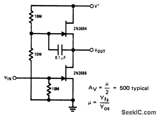 Simpletwo-JFET circuit provides gain of 500 at low power. Reducing drain cument increases gain at sacrifice of input dy-namic range.- FET Databook, National Semi-conductor, Santa Clara, CA, 1977, p 6-26-6-36.