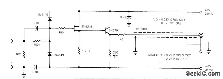 Used to match 10-megohrninputimpedanceto 50-ohm transmission Iine or 50-ohm input of instruments such as spectrum analyzer, video amplifier, or fre-quency counter. Voltage gain is exactly 0.5. Fre-quency response is from DC to 20 MHz and can be boosted by using higher-frequency transis-tor.-M. J. Salvati, FET Probe Drives 50-Ohm Load, EDN Magazine, March 5, 1973, p 87 and 89.