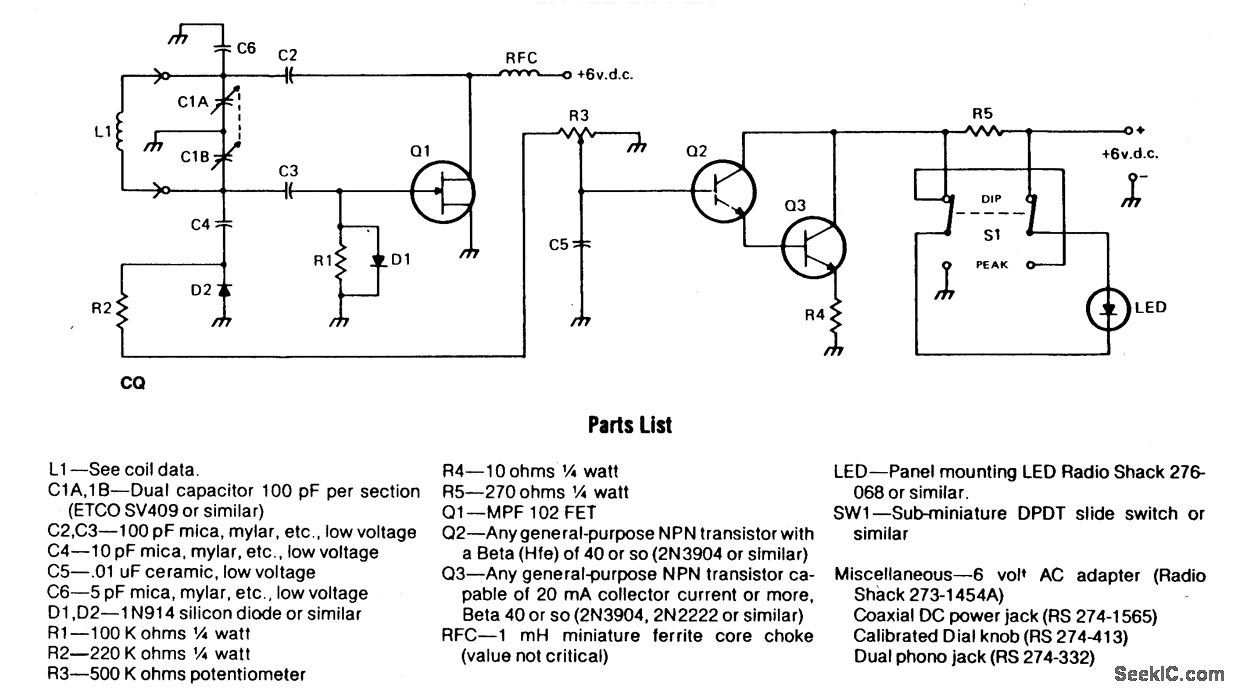 The circuit consists of two basic circuits, the oscillator and the detector. The oscillator uses an FET in a Colpitts configuration. The energy circulating in the oscillator tank is coupled through C4 to the detector circuit, where a small diode (D2) rectifies it, feeding a dc voltage to the Darlington pair (Q2, A3) con-trolled by the sensitivity control (R3). Any smallvariations in the bias of the amplifier will cause large variations of current through the LED indicator in the DiP mode; however, in the PEAK mode the current produces a corre-sponding voltage ropthrough R5 and the action of the LED is reversed. The circuit shown will work practically on any frequency from LF to VHF if the appropriate components are used.