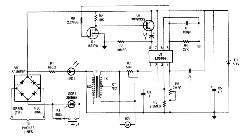 U1, an LS3404 melody chip is activated when hold S1 is pressed, which causes SCRI to con-cluct and hold the telephone line via T1, R1, and LED1. The voltage across R1 and LED1 is used to activate the melody chip. Q1 and Q2 form a restart circuit to keep the melody chip going during hold.
