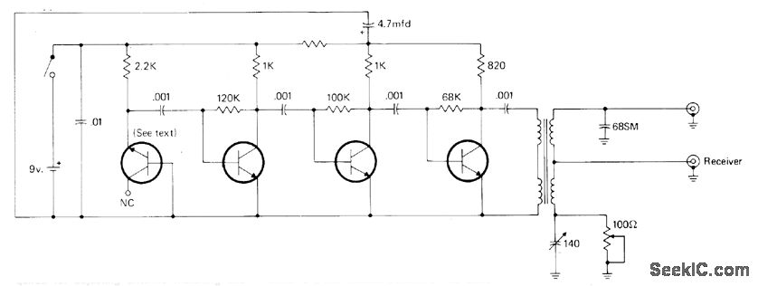 All transistors are 2N5129 or equivalent 2N5137 or 2N5220. Try different transistors until highest noise output is obtained. Toroid core for trans.former is 3/8-inch Indiana General CF102. Quadrifilar winding has 4 1/2 turns of four No.28 enamel wires twisted together, wound on core and connected as on diagram. Noise bridge can also serve as wideband noise source for signal injection during troubleshooting in AF or RF circults, and as noise source for aligning RF cir-cuits,-J.J. Schultz, An Improved Antenna Noise Bridge, CQ, Sept, 1976, p 27-29 and 75.