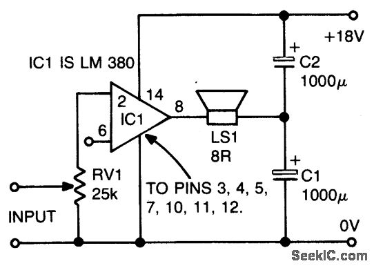 The ground side of the speaker is con-nected to the junction of two equal high value capacitors (1000 μF is typical) across the sup-ply. The amplifier output voltage will be VS/2, and so will the voltage across C1 (if C1 and C2 are equal); so as the supply voltage builds up, the dc voltage across the speaker will remain zero, eliminating the switch-on surge. C1 and C2 will also provide supply smoothing. The circuit is shown with the LM380, but could be applied to any amplifier circuit, providing that the dc voltage at the output is half the supply voltage.