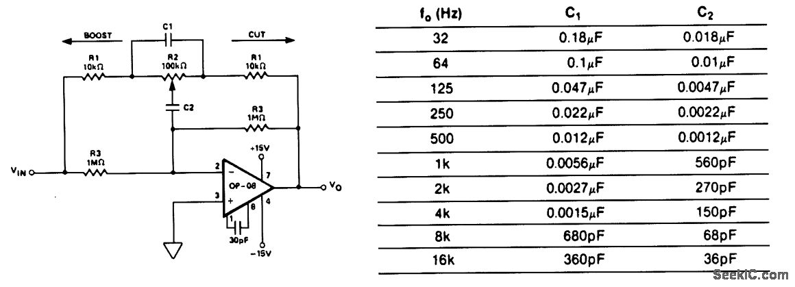 This circuit is one section of an octave equalizer used in audio systems. The table shows the val-ues of C1 and C2 that are needed to achieve the given center frequencies. This circuit is capable of 12 dB boost or cut, as determined by the position of R2. Because of the low input bias current of th,e OP-08, the resistors could be scaled up by a factor of 10, and thereby reduce the values of C1 and C2 at the low-frequency end. In addition, 10 sections will only draw a combined supply current of 6 mA maximum.