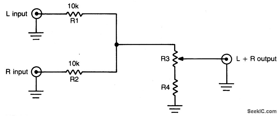 This simple circuit can be used to combine stereo signals to produce a mnaural output. R1 and R2 isolate both circuits and R3 controls the level of the combined output signal.