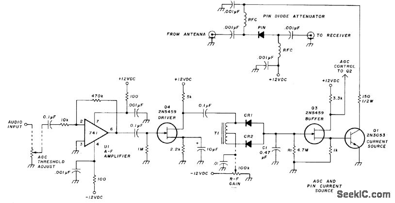 Designed for insertion between antenna and input of any HF receiver to improve adjacent-channel selectivity by providing attenuation ahead of mixer for entire tuning range. Hewlett-Packard 5082-3379 PIN diode has very low impedance when conducting and very high impedance when biascurrent is small. NPN transistor Q1 provides over 100 mA as current source to PIN diode. Q1 is driven by AGO circuit through JFET buffer Q3.AGC voltage is derived from top of audio gain control in receiver for rectification, with 200 mVRMS at input of opamp U1 giving maximum attenuation. Center tap of T1 (any small AF transformer) can be grounded. CR1 and CR2 are germanium diodes. Article also gives circuit of IF system using cascaded 9-MHz crystal filters to improve selectivity further and provide over all AGC control range of 70 dB.-M. Goldstein, Improved Receiver Selectivity and Gain Control, Ham Radio, Nov. 1977, p 71-73.