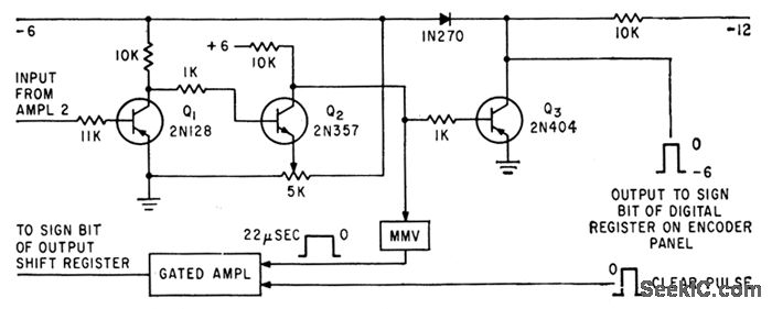 Q1-Q2 amplify negative analog samples greater than 100 mv, to provide sharp pulse output for driving monostable mvbr in analog-digital converter.-N, Aron and C, Granger, Analog-To-Digital Converter Uses Transfluxors Electronics, 35:20, p 62-66.