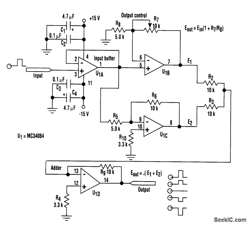 By adjusting one potentiometer, this circuit's output can be varied from a positive-going version of the input signal, smoothly through zero output, then to a negative-going version of the input (see the figure). If the input signal is a positive pulse of, for example, +2-V peak, the output pulse amplitude can be smoothly varied from +2-V through ground (no output) to a -2-V peak.