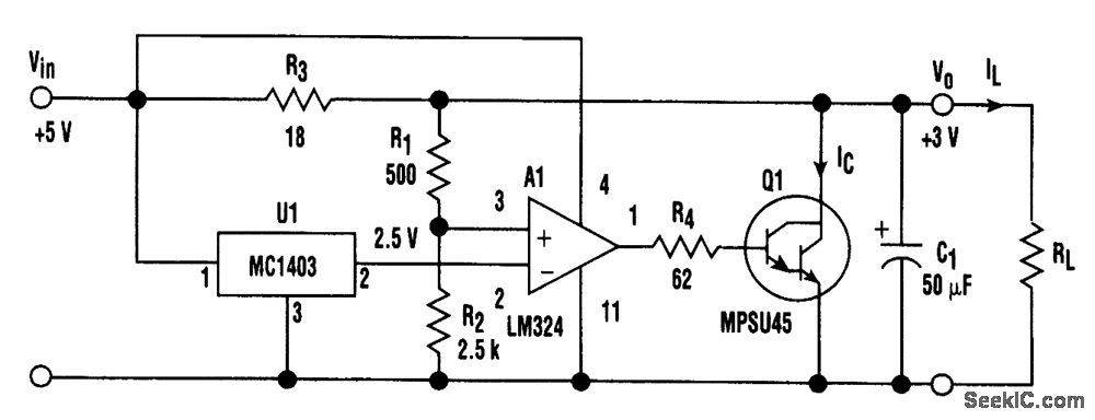 Generally speaking, conventional positive voltage regulators can only source current; they can't sink it. However, the positive regulator shown breaks that rule because it can perform both functions.The idea is to have the control transistor Q1 in shunt so that the regulator can either source or sink current.The circuit provides +3-V output from a +5-V supply. U1 is a bandgap reference that supplies a stable +2.5-V reference to the error amplifier (A1). The output voltage (VO) is sampled by the resis-tor network (R1 and R2). If VO were to increase, A1 will drive the base of Q1 harder, increasing the collector current (IC).This increases the drop across R3 and VO decreases, thus regulating the output voltage. The output voltage is givenby VO = 2.5(1 + R1/R2)Under no load conditions, Q1 draws 110 mA [(Vin-VO)/R3]. With a load connected, and as the regulator begins to source load current (IL), IC decreases to keep the drop across R3 constant.At IL 100 mA, Q1 carries 10 mA. If RL is connected to the positive supply higher than VO, then the regulator must sink current, and IL becomes negative. At IL = -100 mA, Q1 carries 210 mA while maintaining the output voltage at +3 V. The output voltage will remain constant at +3 V—even if the load current changes sign.With the proper heatsink on Q1, the regulator can sink more than 300 mA. If a sink only option is desired, the dissipation in Q1 can be reduced by using a 180-Ω resistor for R3. R4 limits the base current drive for Q1 and prevents the output of A1 from being clamped at 2 VBE.